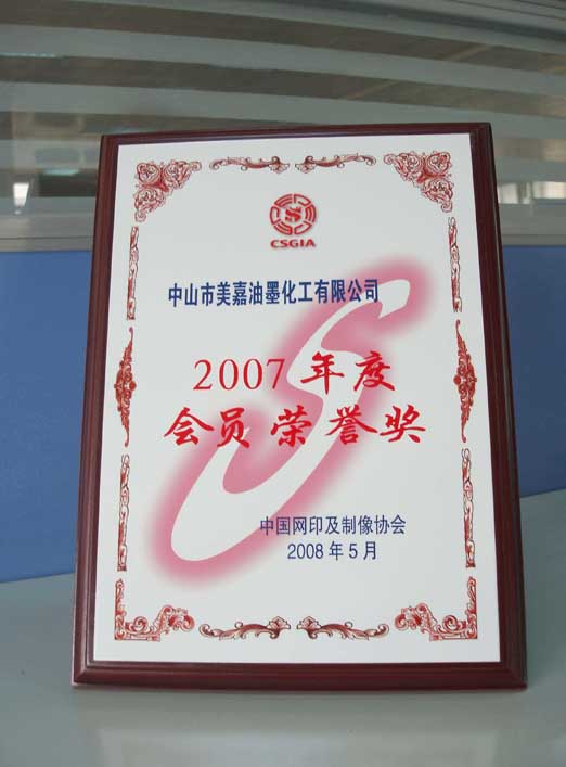 2008年5月,張總至杭州參加中國網(wǎng)印及制像協(xié)會(huì)相關(guān)會(huì)議時(shí)。大會(huì)為公司頒發(fā)了“2007年度會(huì)員榮譽(yù)獎(jiǎng)”,以致表彰美嘉公司在協(xié)會(huì)及油墨行業(yè)中所做出的貢獻(xiàn)。